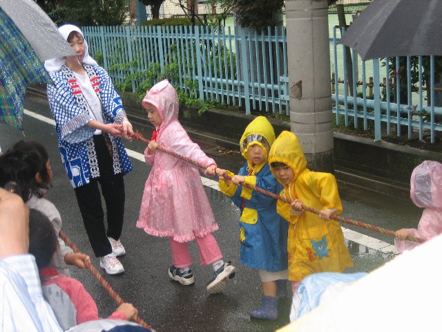 近所のお友達と一緒に秋祭りにも参加しました。山車のひきまわしはあいにくの雨ですが、レインコートを着て参加。