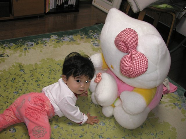 ママがキティちゃんの頭をポンポンとなでて、「キティちゃん」って言うと