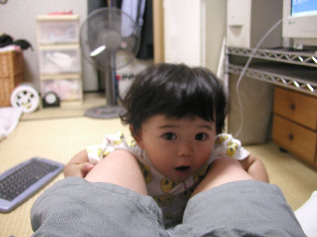 ママが座っていると、ハイハイして膝にのぼってきます。