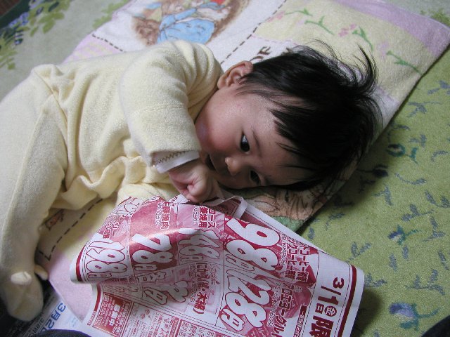 ママが志帆をダッコして新聞や広告を読んでいると、手を伸ばして、掴んで、ぐしゃぐしゃにして、ぶんぶん振りまわします。
