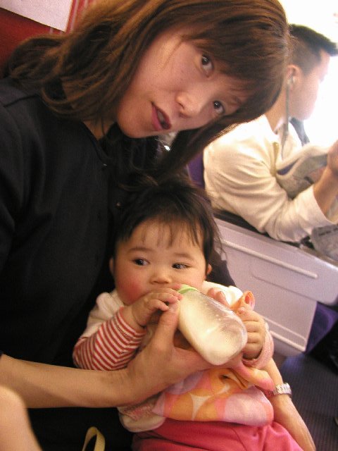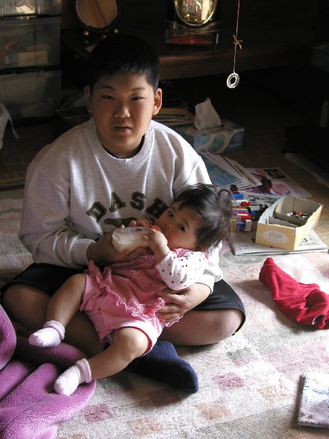 従兄弟のおにいちゃんに、ミルクをもらってご機嫌です。